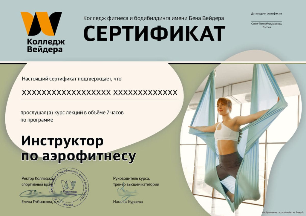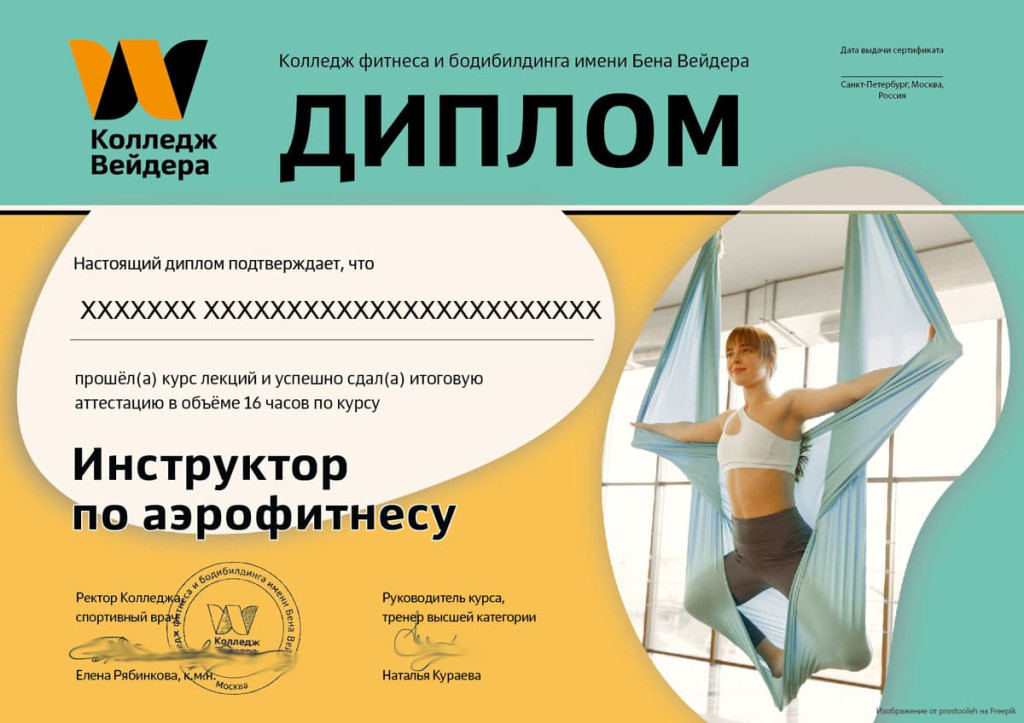 Инструктор по фитнесу в гамаках (аэрофитнес) — это курс для преподавателей в фитнес клубах: для тех, кто хочет расширить свою специализацию и изучить новое направление фитнеса, а также для тех, кто имеет гамак дома и желает узнать, как правильно тренироваться с максимальной пользой для себя.
