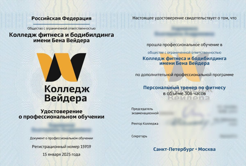 **** после очной части в Москве или Петербурге в дополнение к сертификатам, выдаются два диплома: «Инструктор фитнеса, бодибилдинга, тренажёрного зала» и «Персональный тренер».
